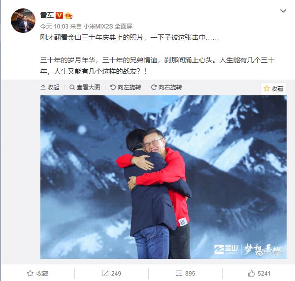 雷军也难掩激动:“ 30 年不懈奋斗的岁月里,我跟张旋龙、求伯君以及众多为金山奋斗过的兄弟姐妹们肝胆相照、亲密无间,这份兄弟情始终没有改变。
